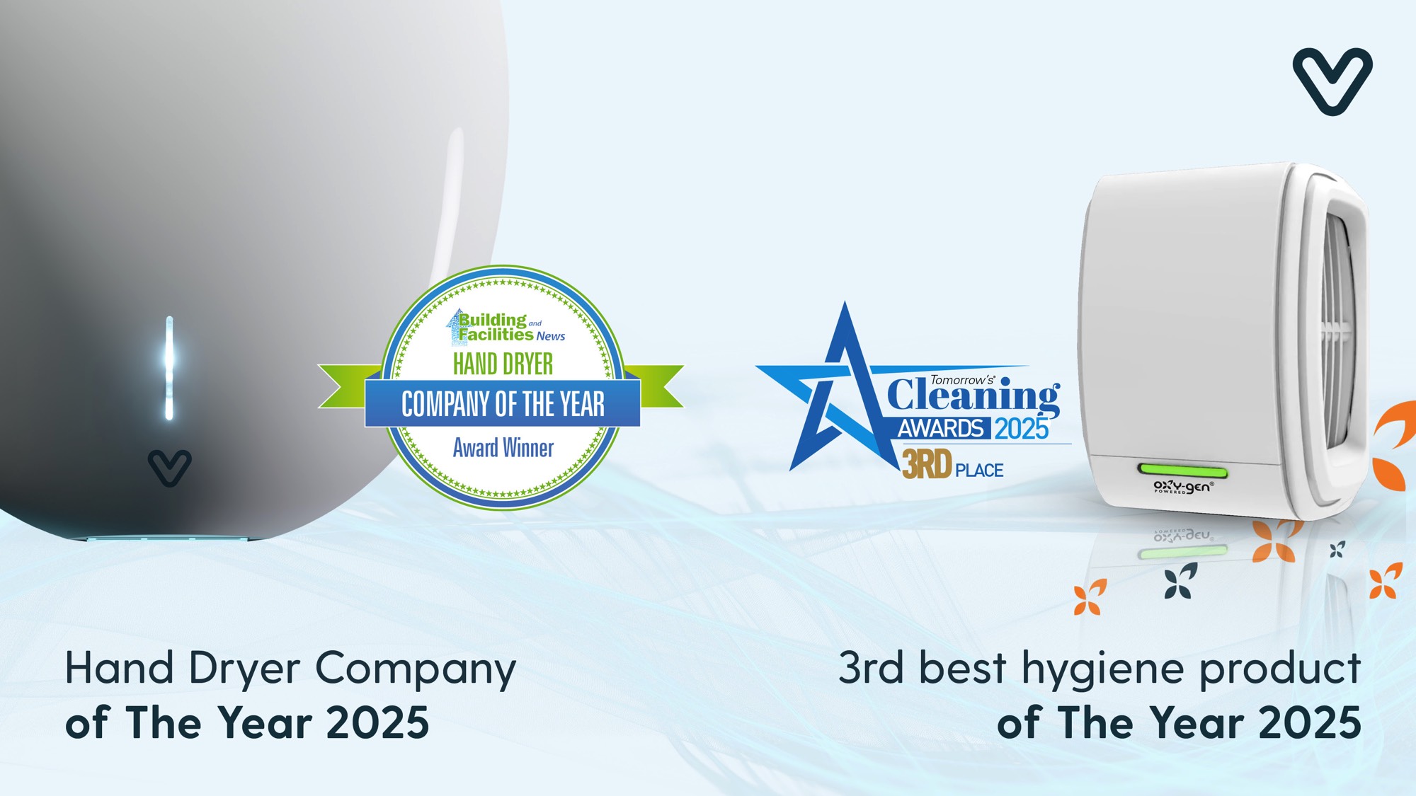 We’re thrilled to announce that Velair Group has been awarded ‘Hand Dryer Company of the Year 2025’ by Building and Facilities News and has also secured 3rd place for ‘Best Hygiene Product of the Year 2025′ for our Oxygen-Supreme air fragrance dispenser in Tomorrow’s Cleaning Awards!’